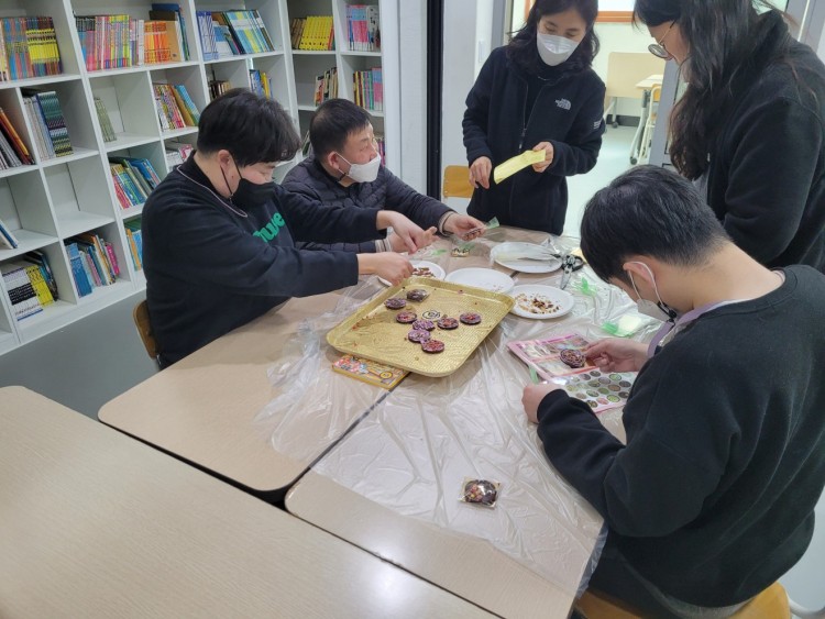 초콜릿이 다 굳으면 초코펜으로 본인이 원하는 모양을 그려서 꾸몄답니다~ 포장해서 집에서 가족들과 나누어먹었어요~~
