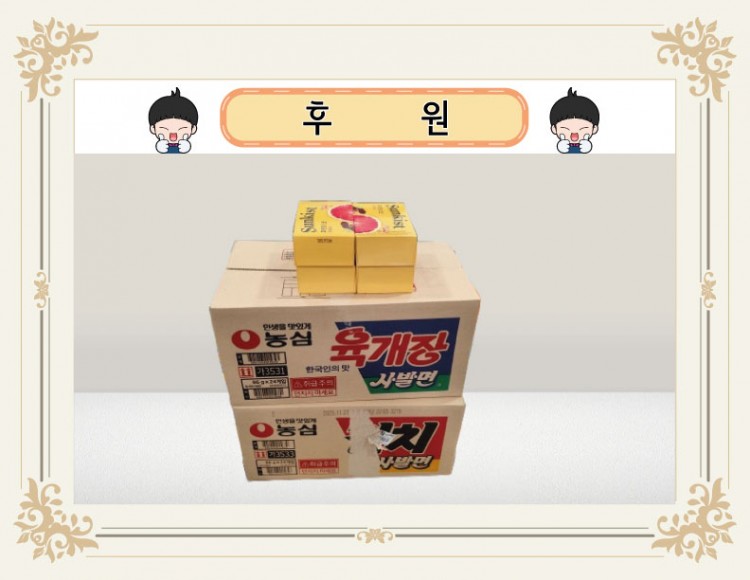 이번에도 컵라면 2박스와 과일허브청 4박스를 후원해주셨습니다.