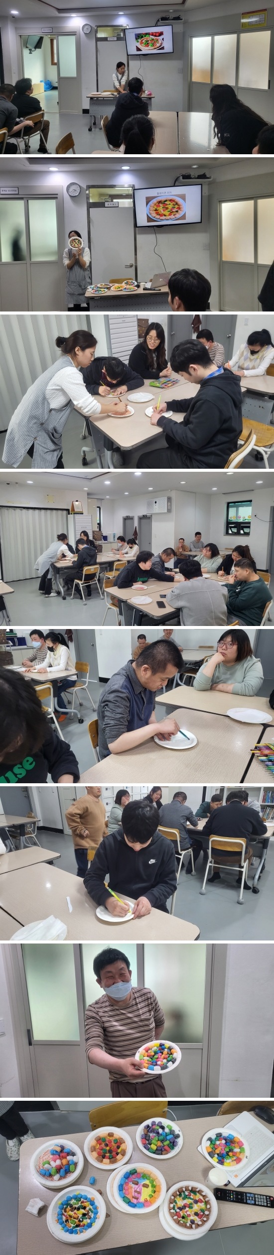 일회용 접시에 색연필로 밑그림을 그린 후에 플레이콘을 물에 적셔 진짜 피자처럼 꾸미고
